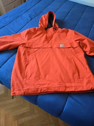 Abrigo tipo anorak de la marca Carhartt en color naranja. Es una prenda cómoda y versátil. - Capucha ajustable con cordones. - Bolsillo canguro en la parte delantera. - Puños elásticos. - Cordón ajustable en el bajo.