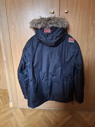 Abrigo tipo anorak de la marca Napapijri. - Diseño con capucha. - Bolsillo frontal grande. - Cierre parcial con cremallera. - Parche con logo en el pecho. - Bandera de Noruega en el bolsillo.