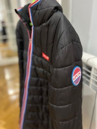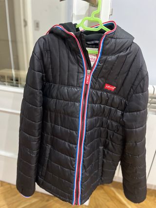 Abrigo anorak Levi's de color negro. - Diseño acolchado. - Cremallera frontal con detalles de color. - Capucha integrada. - Logo de la marca en el pecho. Talla 16 En perfecto estado para poder seguir siendo usada