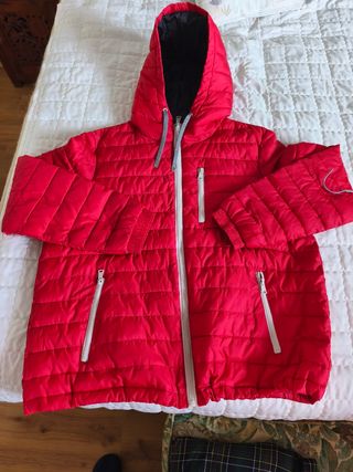 Anorak rojo acolchado con capucha forro interior.