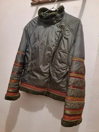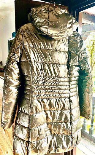 Anorak acolchado de color verde, con un diseño moderno y detalles que marcan la diferencia. - Destacar la cremallera del bolsillo derecho se salió y no funciona y el cuello por dentro está más oscuro del roce ver últimas fotos. - Cierre frontal con cremallera dorada. - Detalle de tachuelas doradas a lo largo de la cremallera. - Bolsillos laterales con cremallera. - Cuello alto.