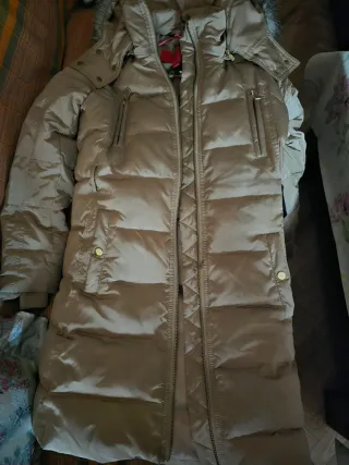 NUEVO CON ETIQUETAS. ME CADUCÓ EL TICKET. Anorak largo acolchado relleno de pluma 50% y plumón 50%. Resistente al agua y al viento, con aislamiento térmico para climas fríos. Comodidad dentro del rango de temperaturas específicas para baja actividad (3°) y actividad moderada (-30°C). Cuello subido con capucha ajustable con cordones y manga larga con puño interior con abertura para el dedo. Bolsillos delanteros con forro polar interior. Correas interiores para colgar la chaqueta de los hombros. Bajo con cremalleras laterales. Cierre frontal con cremallera. El tejido repele el agua, lluvia ligera durante periodos cortos