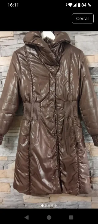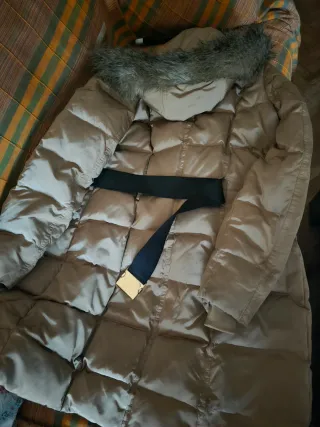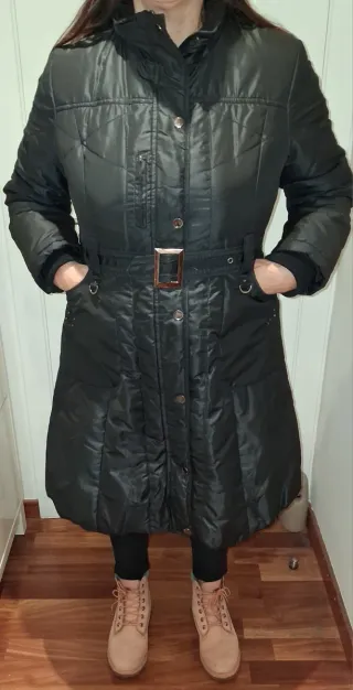 Chaquetón largo acolchado con cinturón. La cremallera está un poco deshilachada en la parte inferior como se ve el la foto, hay que cerrarla con delicadeza, pero corre perfecta. - Diseño acolchado. - Cierre de botones y cremallera. - Bolsillos frontales.