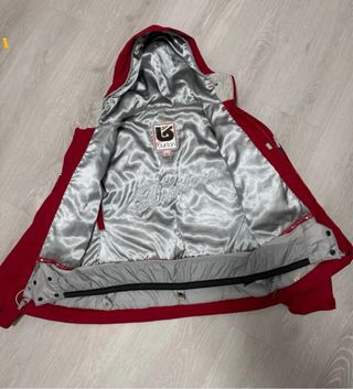 Anorak de nieve Burton en color rojo, ideal para actividades al aire libre. - Diseño con capucha. - Forro interior plateado. - Detalles de parches en la manga izquierda. - Cremallera frontal. - Puños ajustables. - Cintura interior En perfecto estado