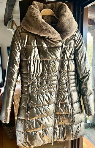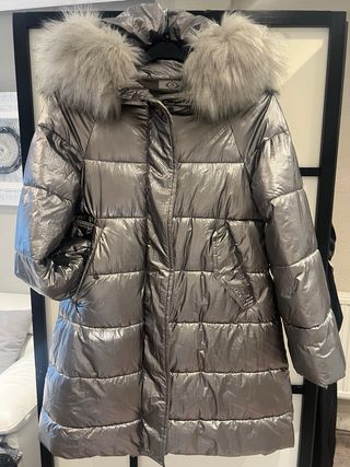 Anorak acolchado con un acabado plateado y moderno. Cuenta con una capucha adornada con pelo sintético muy bonito que le da un toque extra de estilo y cálidez. - Diseño acolchado. - Capucha con detalle de pelo. - Cierre frontal.