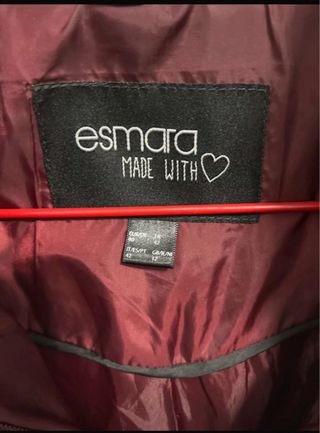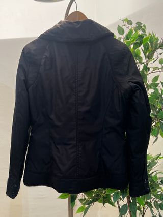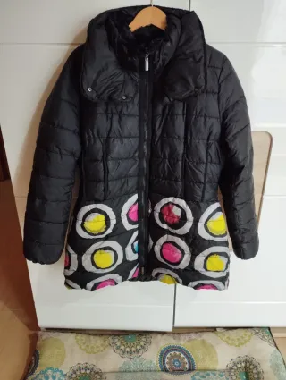 Anorak acolchado con un diseño llamativo en la parte inferior. Forro como de peluchito negro, abriga bastante. Es talla 46, pero talla un poco justo. Mejor 44 o 46 justita. Cierre de cremallera frontal - Cuello alto con forro interior. - Puños elásticos.