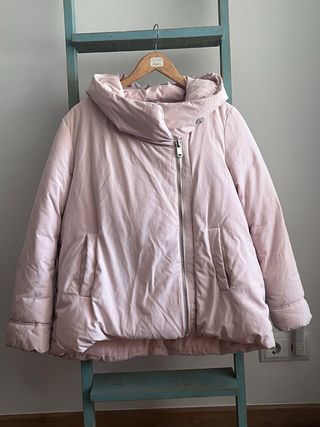 Anorak de Zara en color rosa pálido. Diseño moderno y cómodo. - Cremallera frontal asimétrica. - Cuello alto /capucha - Bolsillos laterales. - Talla L pero justa, más bien M