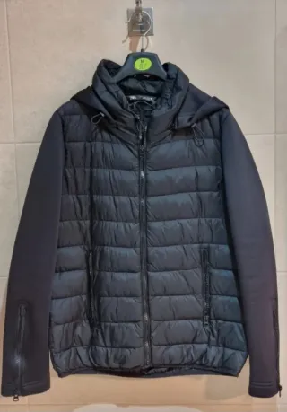 Anorak de la marca Zara en color negro. - Diseño acolchado en el cuerpo. - Mangas de tejido liso. - Capucha integrada. - Cremallera frontal completa. - Bolsillos laterales con cremallera.