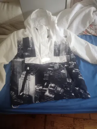 Anorak de Pull&Bear con un diseño urbano llamativo. - Mangas y capucha en blanco. - Cuerpo estampado con silueta de ciudad en blanco y negro. Como nueva linpia