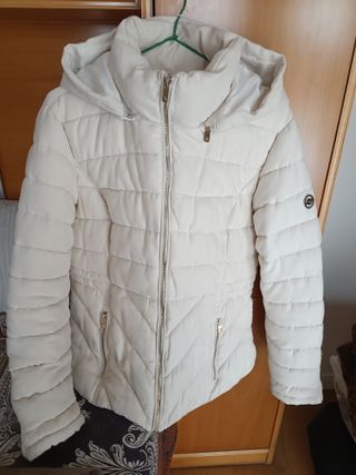Abrigo/ Anorak de color blanco, ideal , no pesa, pero es muy cálido . Cómodo - Capucha con detalle de pelo sintético. - Cierre de cremallera frontal. - Dos bolsillos laterales con cremallera. Valido para talla 42 /44. Como nuevo