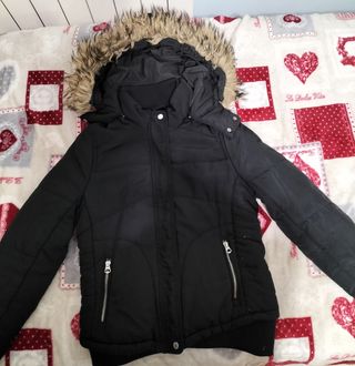 Chaqueta de mujer de invierno Bershka color negro con cremallera y 2 bolsillos. En la capucha lleva pelo marrón para decorar, pero se puede quitar ya que va con botones, como se ve en las 2 últimas fotos. De largo la chaqueta llega a la altura de la cintura (no cubre las piernas). Por dentro se aprecia que no hay roturas del forro, y por fuera tampoco. Es talla L según la etiqueta, pero yo la considero más una M, ya que es la talla que uso habitualmente y me queda bien sin que me sobre de largo de mangas ni de anchura. Las cremalleras y botones funcionan correctamente. Es gruesa, para llevar cuando hace frío. La vendo porque no la uso.