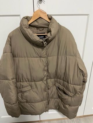 Anorak de la marca Pull&Bear en color beige. Es una prenda de abrigo con un diseño moderno y acolchado. Es muy grande estilo oversize. - Cuello alto. - Cierre de cremallera. - Bolsillos laterales con cremallera.