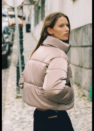 Anorak brillante con un acabado satinado. - Diseño acolchado. - Cuello alto. - Corte cropped. - color cava