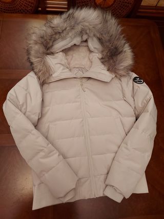 Anorak de plumas para mujer, relleno de plumas, no de acrílico. Color blanco roto, en tallado y con capucha desmontable. Muy ligero y abrigado, ideal para la nieve, porque llega a las caderas y permite movilidad de piernas. De Zara. Perfecto estado