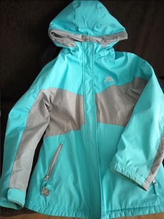 Edad 14-16 años o L infantil. Marca Zeroxposur. Unisex. Anorak de nieve impermeable turquesa/gris, con cremalleras en los bolsillos. Forro polar a juego peludito desmontable, para llevarlo por separado o ajustado al anorak mediante corchetes y cremalleras, para una máxima comodidad. Ambos como nuevos. Impermeable Chubasquero