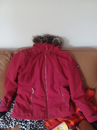 abrigo Roxy impermeable, talla xs, con cremallera y velcro, bolsillos exteriores e interiores, también en el brazo, cremalleras en las axilas para mayor transpiración, ajustable abajo para que no entre nieve con enganches para guantes, también dentro de los bolsillos. en color fucsia y morado, la capucha se puede ajustar y también quitar completamente.