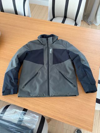 Anorak de esquí para niño o niña, con un diseño moderno y funcional. - Combinación de colores gris y verde. - Capucha y cuerpo con forro interior. - Cremallera frontal. - Puños elásticos. - 60 largo x 50 ancho.