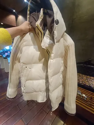 Anorak acolchado de El Corte Inglés en color beige. Según la etiqueta es talla 40, pero sería por tamaño una talla M-38 - Diseño acolchado. - Cierre de cremallera y botones. - Bolsillos laterales con cremallera.