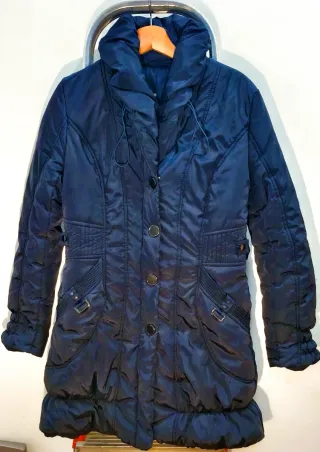 Anorak largo para mujer en color azul. Presenta un diseño acolchado y un cuello alto con cordones. No tiene marca. - Cierre de cremallera. - Bolsillos laterales. - Puños elásticos. - Botones laterales para ajustarlo a la cintura. - Cuello ajustable.