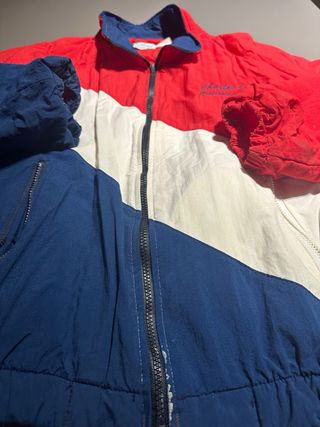 Chaqueta anorak de la marca Dunbrooke con un diseño de bloques de color. Anorak acolchado de Dunbrooke. Talla XL. Está un poco sucio y con señales de uso. - Cierre de cremallera frontal. - Cuello alto. - Puños elásticos. - Bolsillos con cremallera lateral.