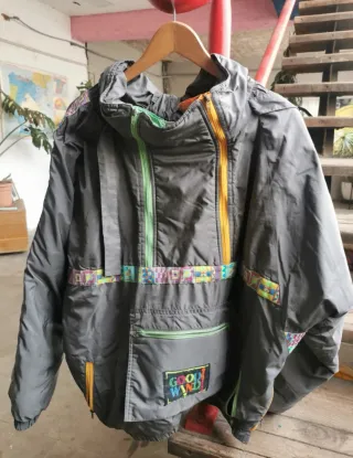 Chaqueta anorak vintage de la marca Good Wind. Un diseño llamativo con detalles coloridos. Algun desperfecto pero conserva todo el calor y forma. La cremallera del bolsillo delantero esta estropeada. - Cremalleras de colores: verde, naranja y amarillo. - Banda decorativa con estampado geométrico. - Bolsillo canguro frontal. - Parche con logo Good Wind en la parte inferior.