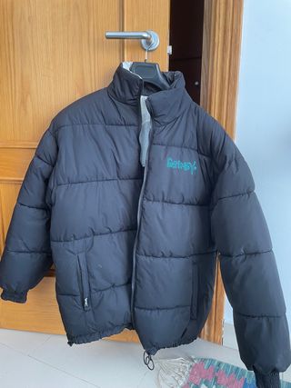 Anorak acolchado Superdry de hombre de color negro y verde oliva, Regular Fit. Talla S. Mide 65 cm de largo, 55cm de ancho de axila a axila y 45 cm de hombro a hombro. Tiene capucha ajustable, cierre de cremallera frontal, dos bolsillos laterales con cremallera y otro bolsillo en el interior. Se ha usado bastante pero esta en perfecto estado.