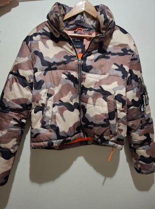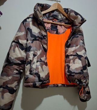 Anorak acolchado con estampado de camuflaje. Talla S oversize. - Cierre de cremallera. - Bolsillos laterales. - Detalle de cordón en la cintura. - Puños elásticos. - Perfecto estado. - Cropped PRECIO NEGOCIABLE