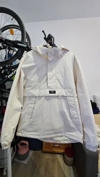 Anorak de Pull&Bear en color crema. Diseño moderno y cómodo. Tiene algunas manchas por el uso, seguro se le pueden quitar pero yo no sé cómo hacerlo. - Capucha integrada. - Bolsillo frontal tipo canguro. - Cierre de cremallera parcial. - Puños elásticos.