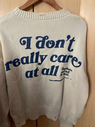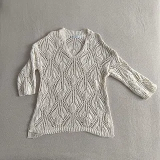 Jersey de punto calado en color beige. Diseño con escote en pico y manga larga. ( Ver medidas en las fotos) - Tejido de punto con patrón calado. - Corte holgado. - Perfecto para cualquier estación.