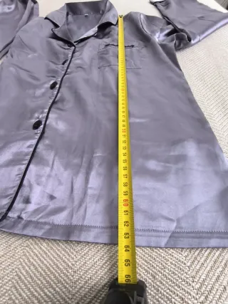 Este pedido trae 🎁 Conjunto de pijama de tres piezas en satén. - Pantalón largo, cómodo y elástico. Largo: 98cm Cintura: Elástico 30-44 cm Muslo: 29cm Tiro: 34cm - Camisa de manga larga con cuello estilo traje, botones y detalles en negro y bolsillo en el lado izquierdo con bordado. Largo: 64cm Ancho: 53cm Manga: 56cm - Camiseta de tirantes regulables negros. Largo: Regulable 45-50cm Ancho: 44cm - Acabado satinado en tono morado grisáceo.