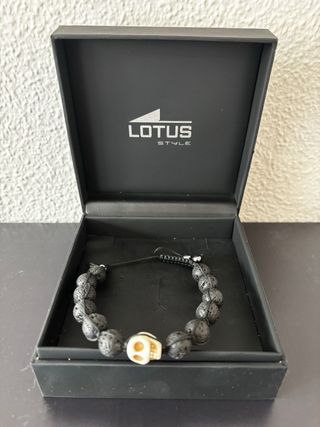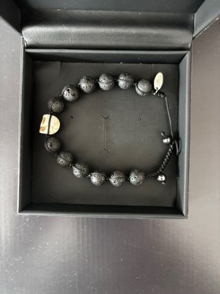 Pulsera con diseño de calavera y cuentas. - Cuentas de piedra volcánica. - Detalle de calavera central. - Cierre ajustable.