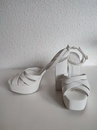 Elegantes zapatos de tacón ancho y plataforma. - Acabado en piel sintética en color blanco. - Tiras cruzadas en el empeine. - Doble ajuste con correa ajustable encima del tobillo y atado debajo. - Tacón grueso y robusto de 12 cm. - Plataforma delantera de 4cm con forma para más comodidad.
