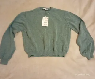 Jersey de punto fino en color verde pálido. Presenta un diseño con mangas abullonadas y puños ajustados. - Cuello redondo. - Tejido suave al tacto.