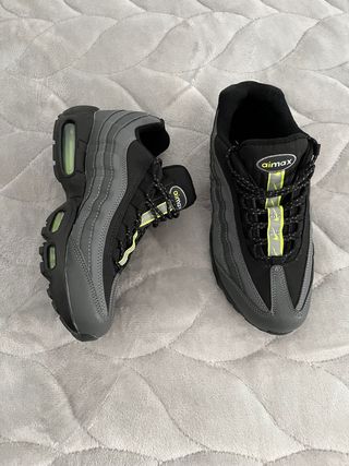 Zapatillas deportivas Nike Air Max 95 en tonos negro y gris. Un clásico con un diseño icónico. - Detalle de líneas onduladas en los laterales. - Unidad Air visible en la mediasuela. - Logotipo de Air Max en la lengüeta.