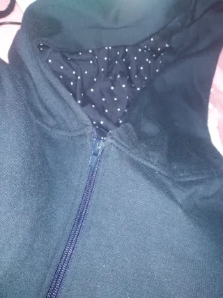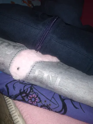Conjunto de tres sudaderas para niña. - Una sudadera azul marino con cremallera. - Una sudadera gris con estampado plateado y pelo Rosa en dibujo y antebrazos - Una sudadera morada con estampado y brillos Vienen pequeñas como para diez años o así