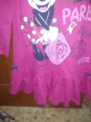 Vestido infantil con estampado de Minnie Mouse. - Diseño con volantes en las mangas y el bajo. - Detalle de lazo en el cuello. - Estampado de ciudades como Londres, Roma y París. Comprado en Disneyland Media manga y volante por abajo