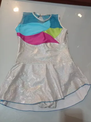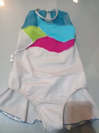 Maillot de gimnasia rítmica con un diseño vibrante y llamativo. Es de niña Muy poco uso, como nuevo - Cuerpo principal blanco brillante con detalles de lentejuelas. - Panel superior de malla azul. - Aplicaciones de tela en forma de pétalo en tonos azul claro, rosa y verde lima.