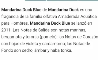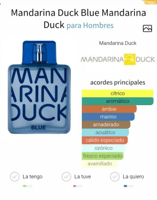 Fragancia Mandarina Duck Blue para hombres. Acepto cambios por otros perfumes - Aroma cítrico y aromático. - Notas de ámbar, marino y amaderado. - Fresco y ozónico.