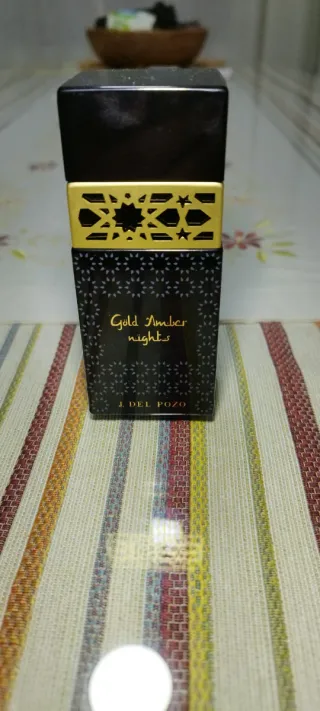 Perfume Gold Amber Nights de J. Del Pozo en su presentación de 100ml. Ultima unidad de este magnífico perfume balsámico especiado. Buenas proyección y duración , frasco realmente bonito. ORIGINAL. Entrego sin caja a estrenar y acepto cambio por otra fragancia. - Diseño de frasco elegante con detalles dorados y negros.