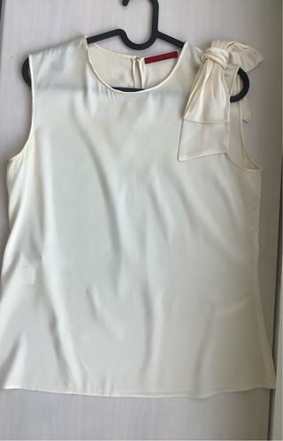 Elegante blusa de seda con un detalle de lazo en el hombro.hombro 36 pecho 46 largo 56 - Diseño sin mangas. - Cierre de botón en la nuca. - Tejido ligero y fluido.