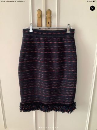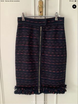 Falda de tejido tweed con detalles en hilo rosa. - Diseño recto. - Largo hasta la rodilla. - Detalle de flecos en el bajo.