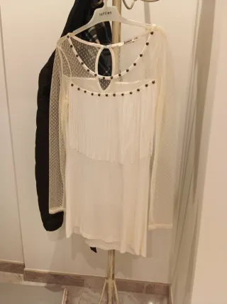 Blusa elegante con un diseño único. - Mangas largas de tejido semitransparente con topitos. - Detalle de flecos en la parte superior. - Adornada con pequeñas tachuelas. - Escote con abertura central.
