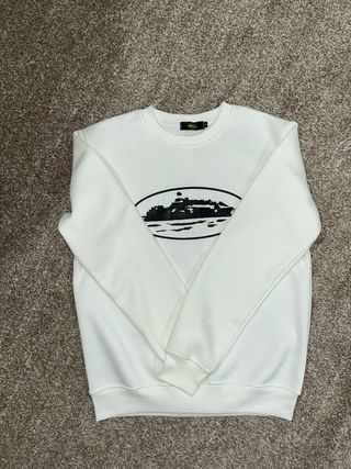 Sudadera de la marca Corteiz en color blanco. Presenta un diseño distintivo en el pecho. - Logo estampado en forma ovalada. - Cuello redondo. - Manga larga.