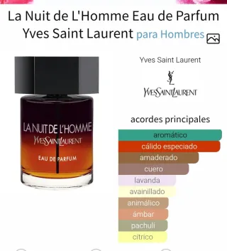Fragancia masculina La Nuit de L'Homme de Yves Saint Laurent. Acepto cambios por otras fragancia. - Notas aromáticas. - Acordes especiados y amaderados. - Toques de cuero y lavanda. - Base de vainilla, ámbar y pachulí.