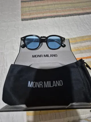Gafas de sol con montura negra y lentes azules. Solo un uso. - Montura de acetato. - Lentes con protección UV. - Incluye funda y paño de limpieza.