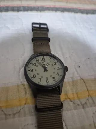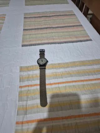Reloj de pulsera con correa de tela. - Esfera clara con números grandes. - Correa de tela resistente.