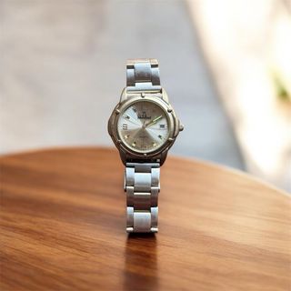 Elegante reloj de pulsera para mujer con un diseño sofisticado. - Esfera con detalles de pedrería. - Brazalete metálico brillante.