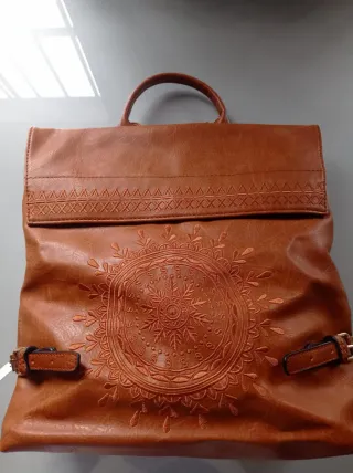 Mochila de cuero con un diseño único y llamativo. Nueva, sin estrenar, con todos los precintos y etiqueta. - Material: Cuero - Color: Marrón - Adorno: Bordado central estilo mandala y detalle en la solapa.