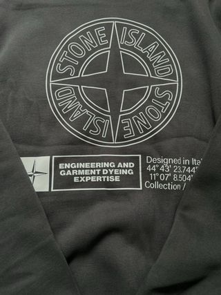 Sudadera gris con el logo de Stone Island. - Diseño circular con el nombre de la marca. - Detalle de texto ENGINEERING AND GARMENT DYEING EXPERTISE. - Coordenadas 44°43' 23.744 y 11°07' 8.504 impresas.