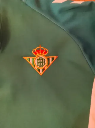 Conjunto de chándal del Real Betis Balompié. - Parte superior verde con detalles blancos. - Pantalón negro. - Escudo del equipo visible.